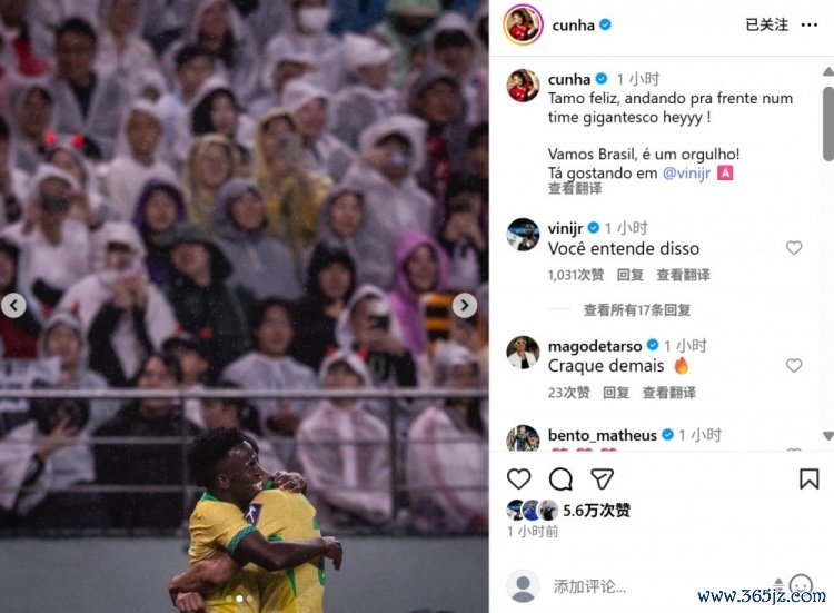赛后库尼亚也在社媒晒出与维尼修斯庆祝进球的合照,配文写说念:“咱们高出安定能与这支伟大的球队赓续前进,加油巴西队,咱们为你孤高。与维尼修斯连线破门!”