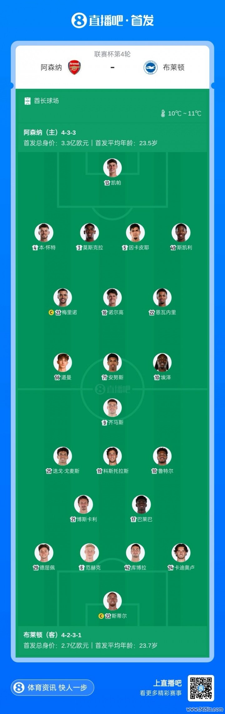 阿森纳首发:13-凯帕、4-本·怀特、3-莫斯克拉、5-因卡皮耶、49-斯凯利、16-诺尔高、23-梅里诺、22-恩瓦内里、56-谈曼、10-埃泽、71-安努斯