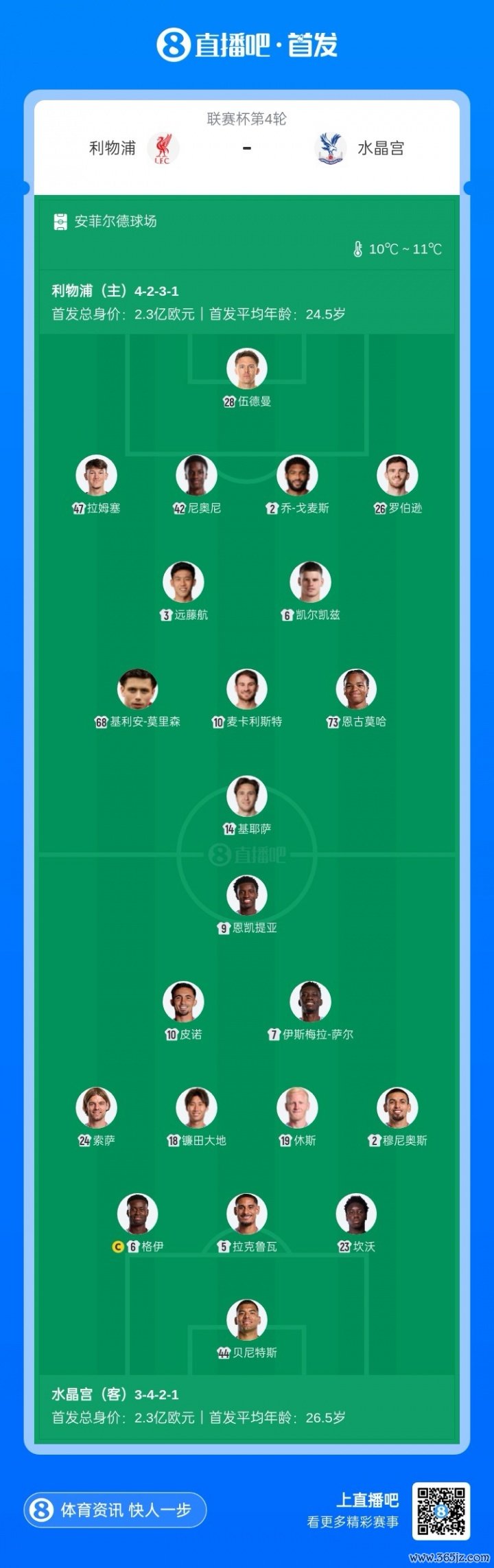 利物浦首发:28-伍德曼、2-戈麦斯、6-凯尔凯兹、26-罗伯逊、47-拉姆塞、42-尼奥尼、3-远藤航、68-莫里森、10-麦卡利斯特、14-基耶萨、73-恩古莫哈