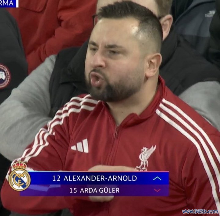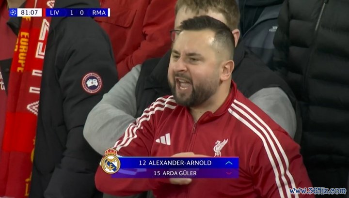 登场时,阿诺德遭到了赤军球迷的“是非迎接”:安菲尔德嘘声四起,镜头给到的一位球迷向他手指着胸前的利物浦队徽,口中想有词,随后这位球迷还折腰亲吻了队徽。