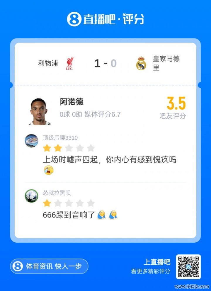 阿诺德的上场并未篡改比赛的走势,最终皇马客场0-1落败。