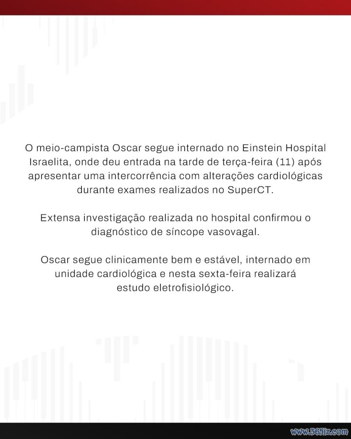 11月14日讯 圣保罗俱乐部官方发布公告,就34岁奥斯卡此前体检时昏倒、腹黑查抄非常一事作念出公告。