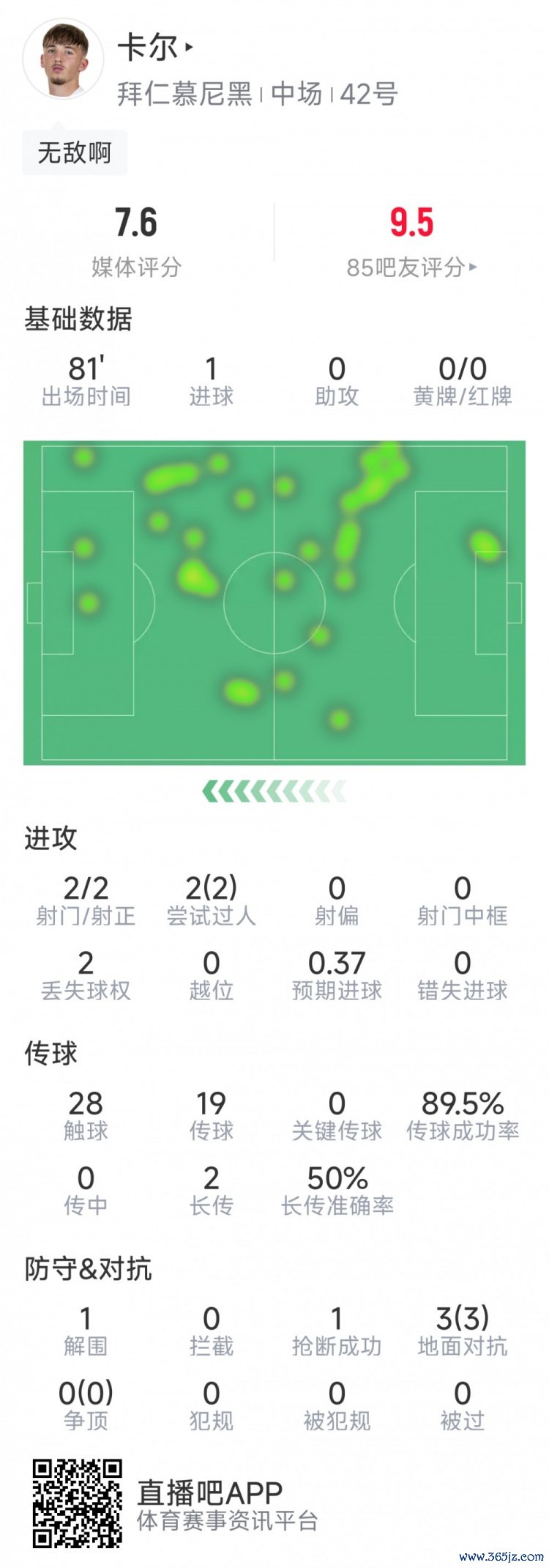 11月27日讯 在本轮欧冠阿森纳对阵拜仁的比赛中,卡尔破门,以下为他在本场数据: