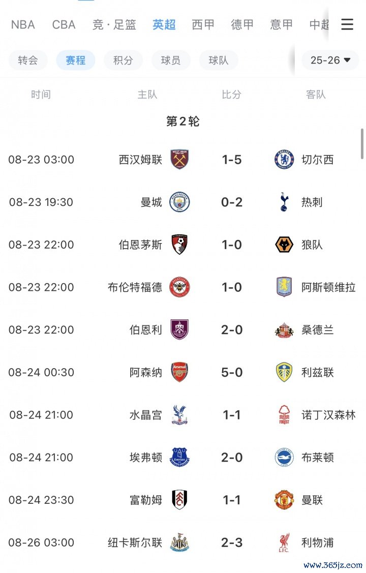 英超第二轮10场比赛赛果: