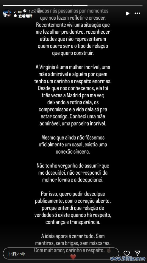 本日维尼修斯发布长文向弗吉尼亚致歉: