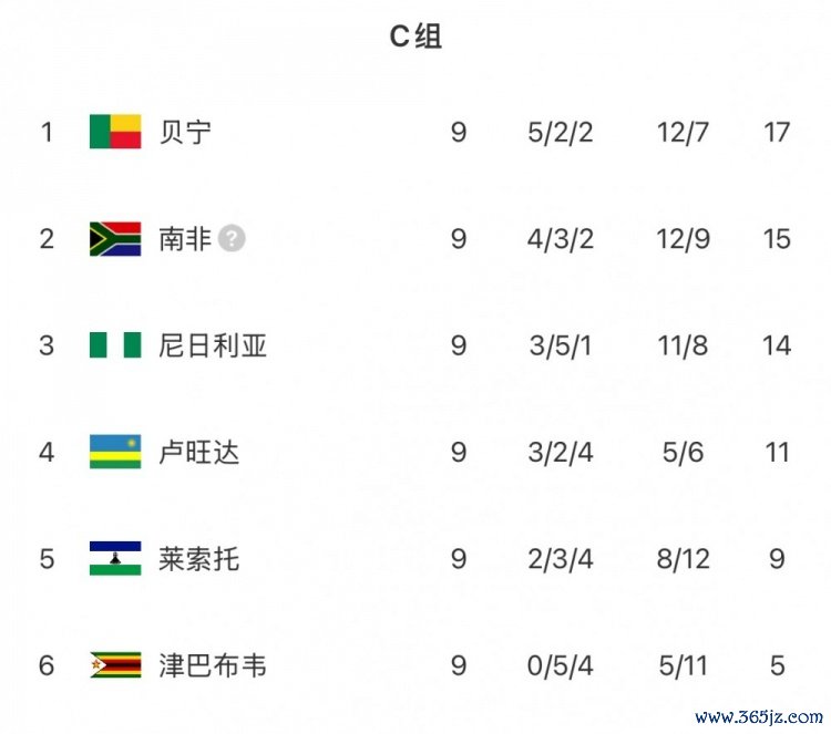9轮事后,贝宁以17分领跑C组,非凡第二名南非2分,第三尼日利亚3分。