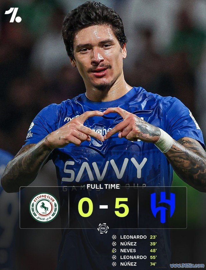 本场比赛努涅斯首发出场梅开二度,此前莱昂纳多一样梅开二度、鲁本-内维斯打进点球,匡助球队大获全胜。