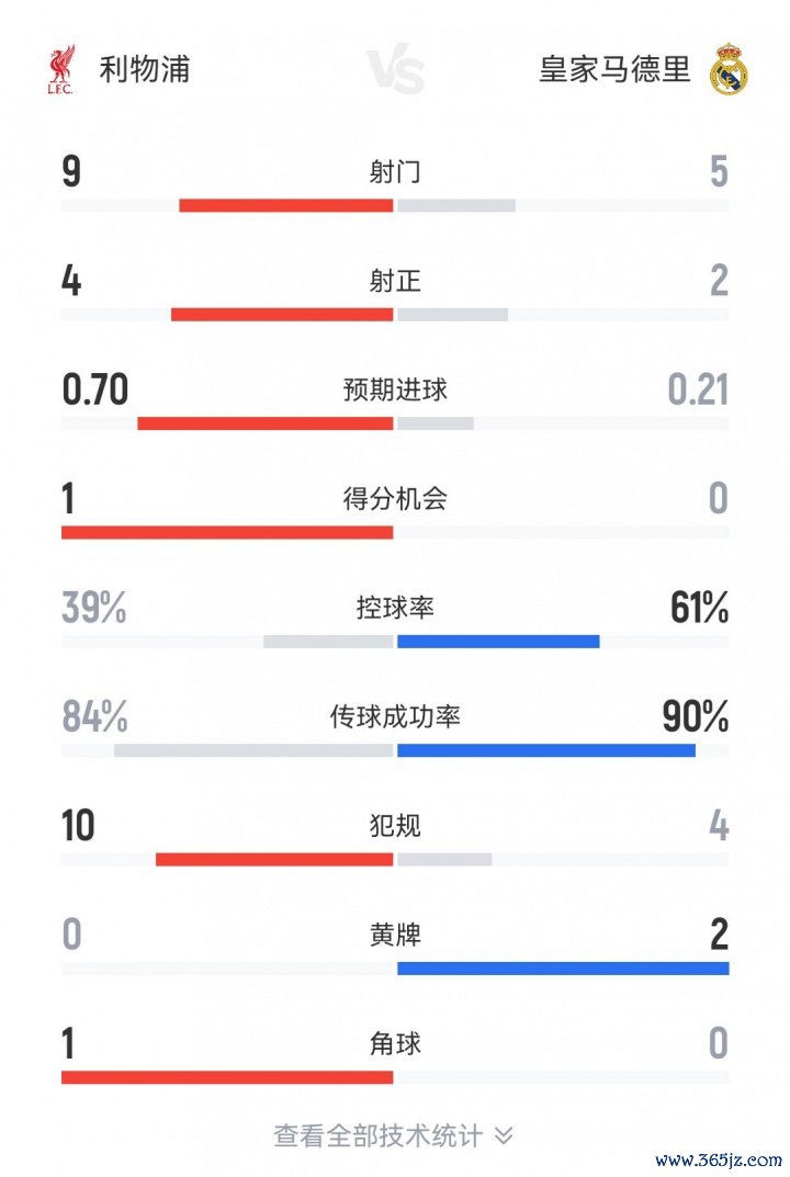 11月05日讯 欧冠第4轮,利物浦vs皇马,半场两边0-0战平。半场数据如下。
