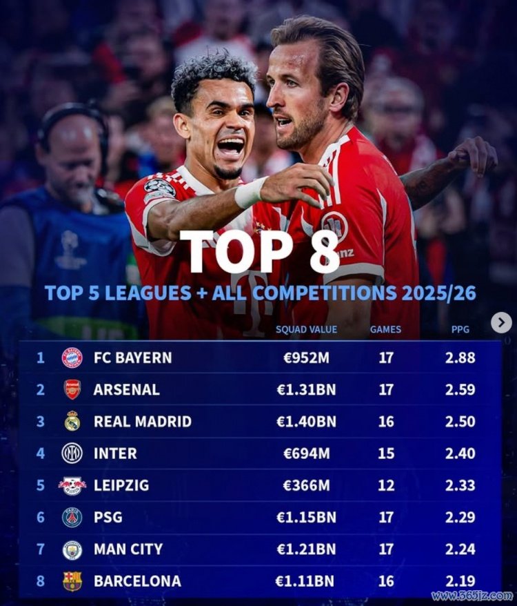 1.拜仁慕尼黑,9.52亿欧元,17场,2.88分