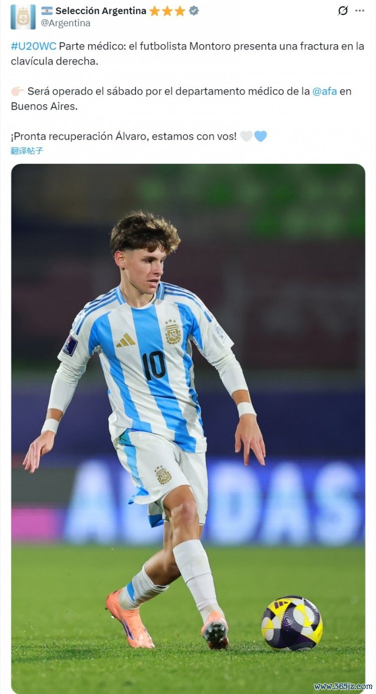 10月9日讯 阿根廷足协官方阐述,阿根廷U20中场蒙托罗右锁骨骨折。