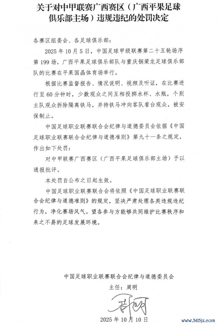 10月10日讯 中足联官方发布照应决定,对广西赛区给予通报品评。