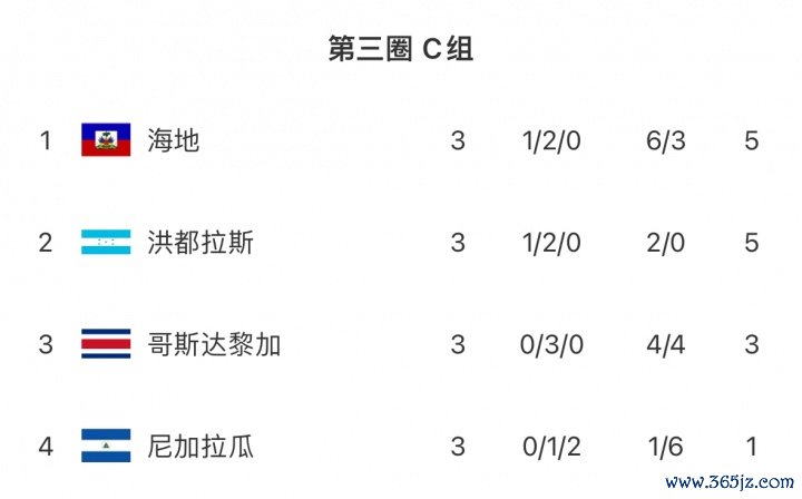 当今在该小组,海地和洪王人拉斯3轮5分分居前二,哥斯达黎加3战3分第三,尼加拉瓜3战1分垫底。