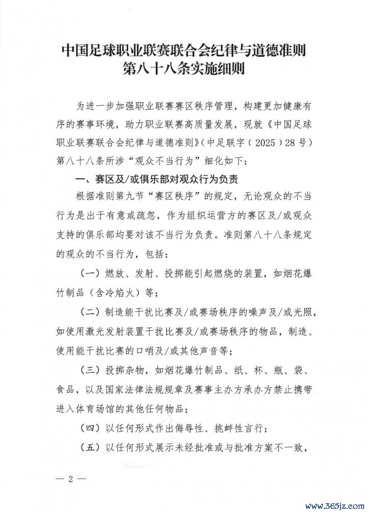 细目就《中国足球劳动联赛相接会顺序与谈德准则》第八十八条所涉“不雅众不妥步履”细化: