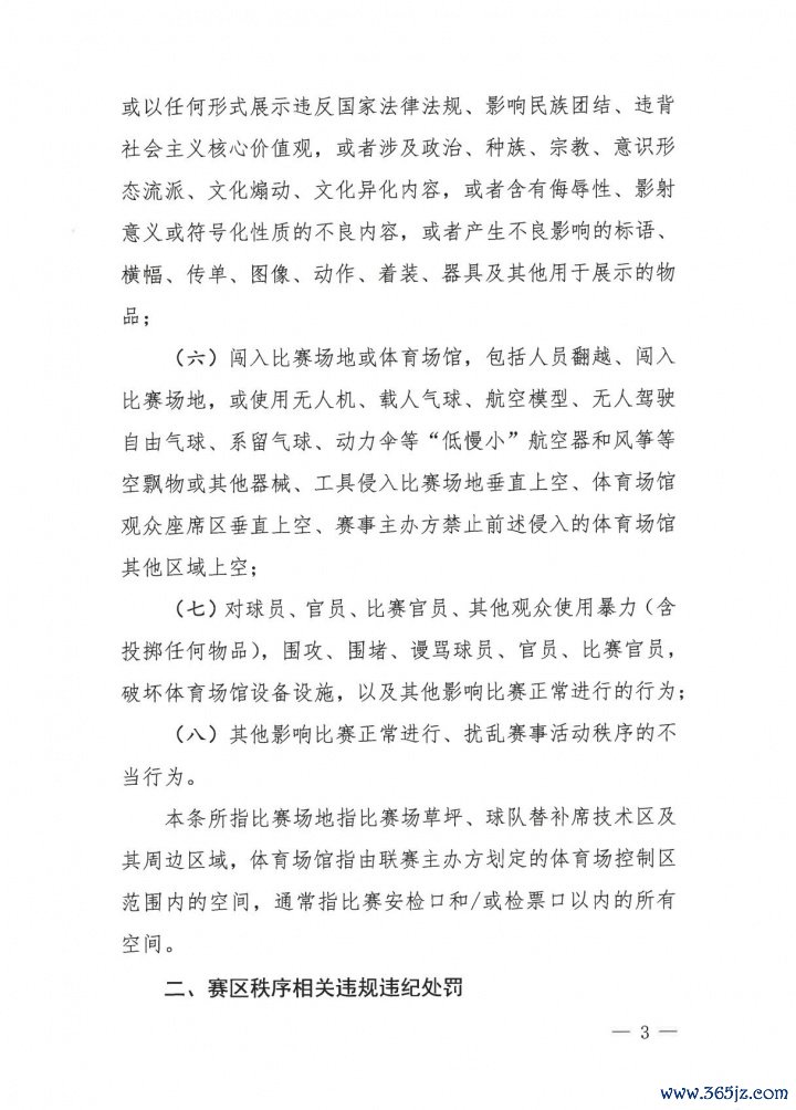 (三)投掷杂物,如烟花炮竹成品、纸、杯、瓶、袋、食物,以及国度法律法则规律及赛当事者持方经办方禁绝佩带插足通顺场馆的其他任何物品;