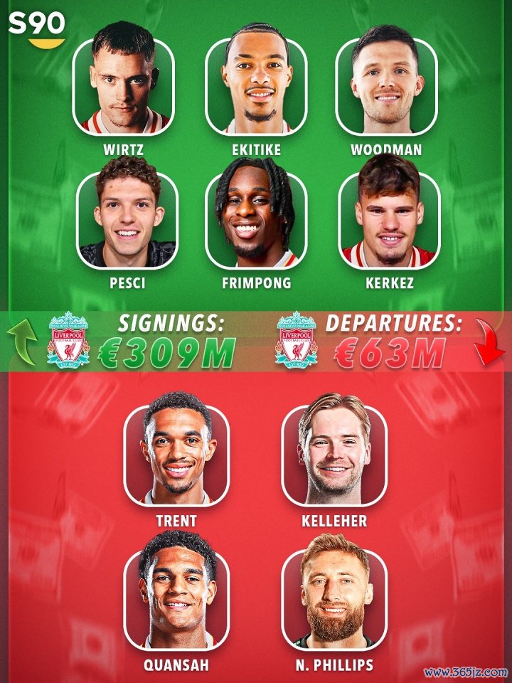 1-利物浦:转会开销3.0868亿欧,转会收入6330万欧,净开销2.4538亿欧