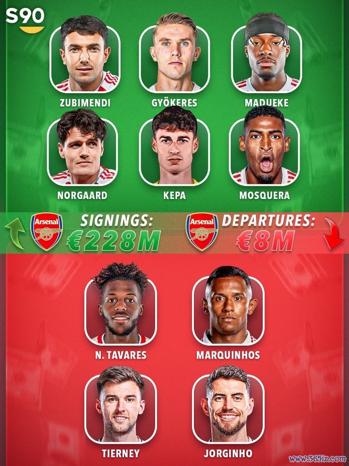 3-阿森纳:转会开销1.578亿欧,转会收入800万欧,净开销1.498亿欧
