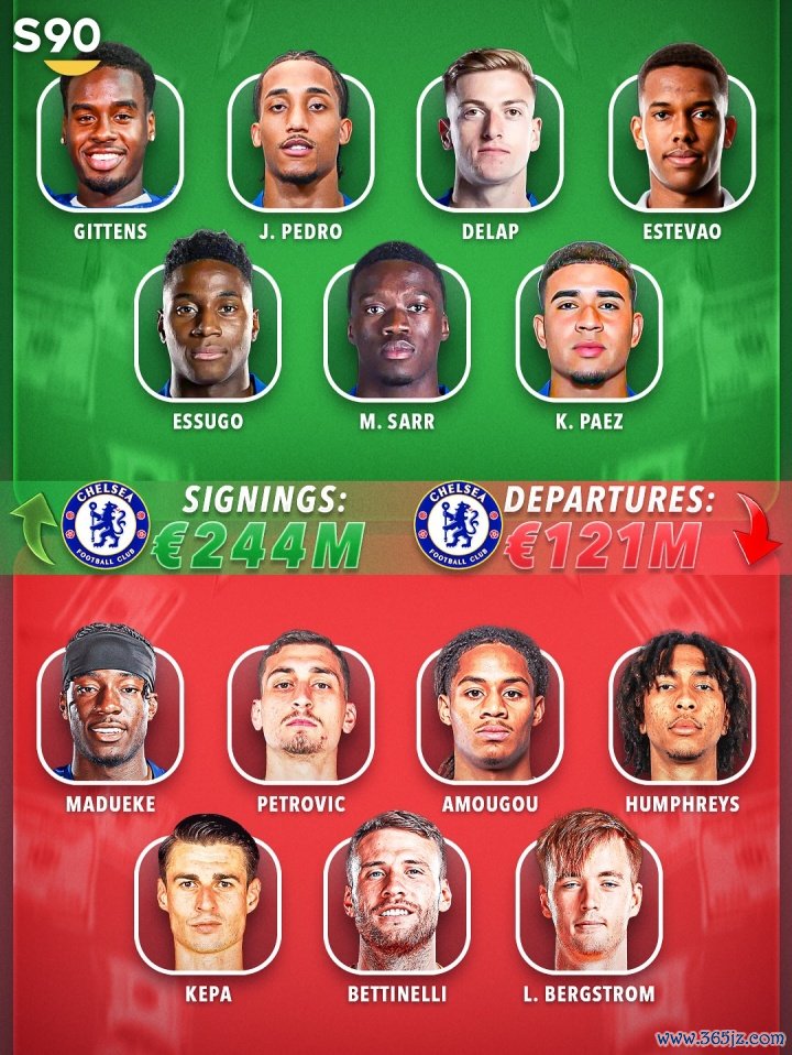 5-切尔西:转会开销2.4377亿欧,转会收入1.2148亿欧,净开销1.2229亿欧
