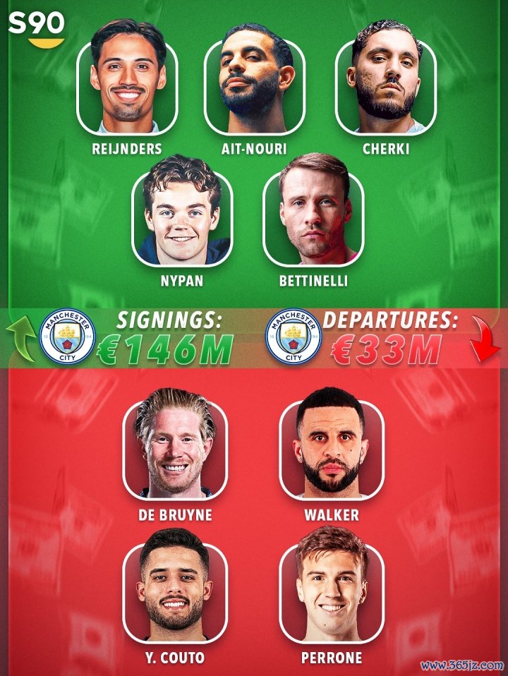 6-曼城:转会开销1.457亿欧,转会收入3880万欧,净开销1.069亿欧