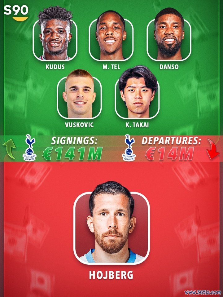 4-热刺:转会开销1.406亿欧,转会收入1350万欧,净开销1.271亿欧