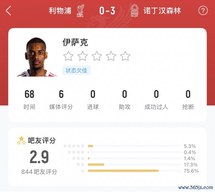11月23日讯 北京时辰昨晚英超第12轮,利物浦0-3负于诺丁汉丛林队,利物浦在夏窗破耗1.45亿欧签下的瑞典先锋伊萨克,本场比赛4项要津数据挂零(进球、助攻、收效过东说念主、抢断)。