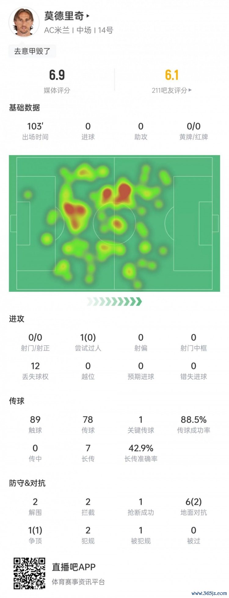 11月30日讯 意甲第13轮比赛,莫德里奇踢满全场,米兰主场1-0打败拉皆奥。