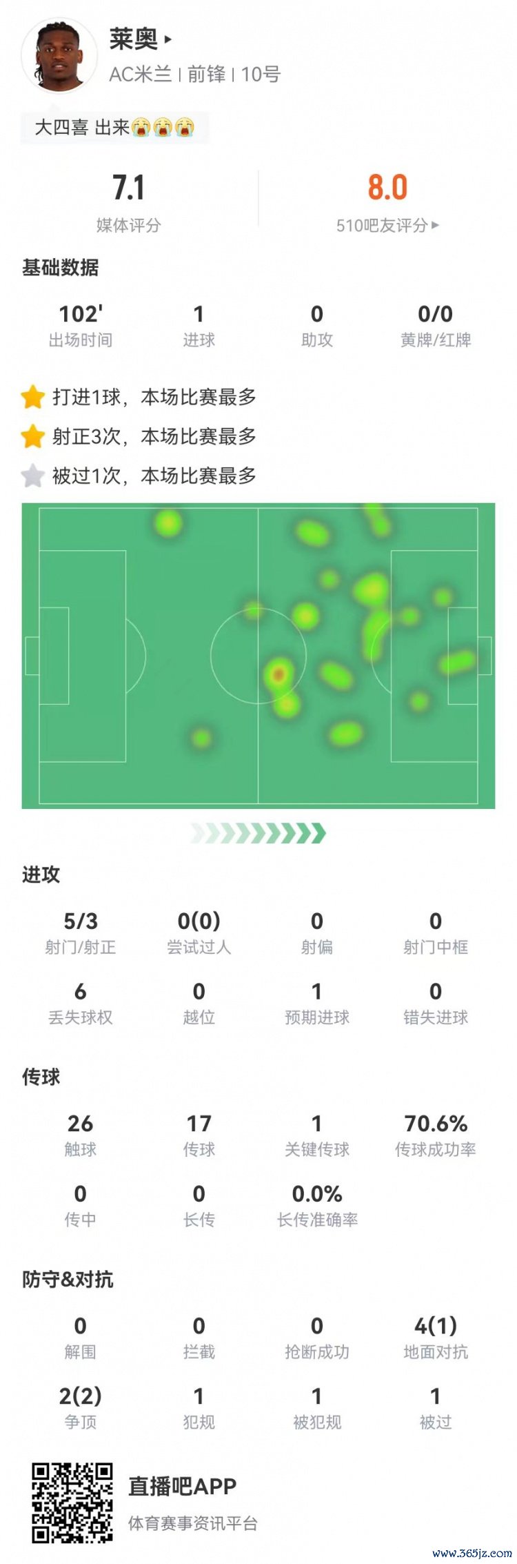 11月30日讯 米兰在本轮意甲对阵拉皆奥,莱奥本场数据如下: