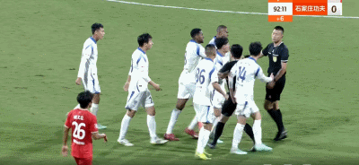 第90+8分钟,石家庄被判点球,队员心思喜跃围攻裁判,随后VAR取消判罚
