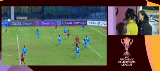 第41分钟,黄宝莹禁区内手球裁判罚点,VAR介入后裁判取消点球