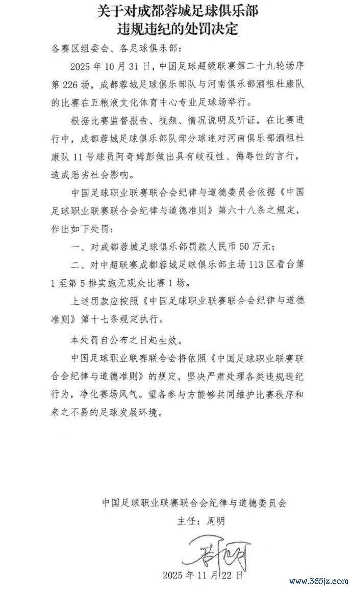 中超第29轮成齐蓉城对阵河南队的比赛,成齐蓉城部分球迷对河南队球员阿奇姆彭作念出具有烦恼性、侮辱性的言行,酿成恶劣社会影响,成齐蓉城被罚金50万元东谈主民币,成齐蓉城主场113区看台第1至第5排抓行无不雅众比赛1场。