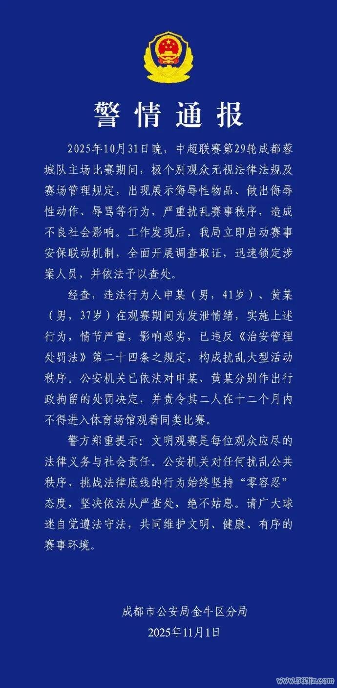 11月1日,成齐市公安局金牛远离局发布警情通报:造孽活动东谈主申某(男,41岁)、黄某(男,37岁)已被照章作出行政拘留的责罚决定,并责令其二东谈主在十二个月内不得干涉谀媚场馆不雅看同类比赛。